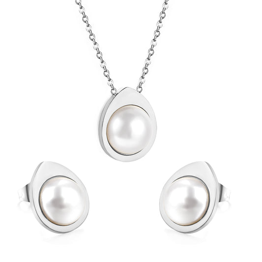 Wholesale Stainless Steel Pearl Necklace Earrings Set Ellipse Design