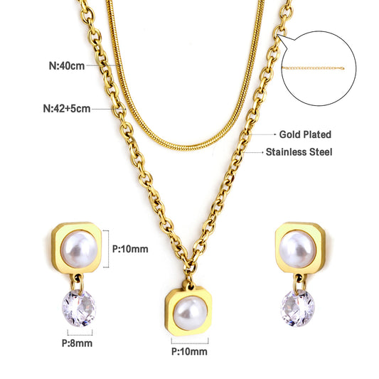 Wholesale Stainless Steel Pearl and CZ Necklace Earrings Set Tiered Luxury Design