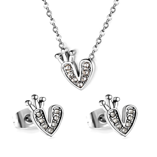 Wholesale Stainless Steel Royal Heart Necklace Earrings Set Crown Detail Design
