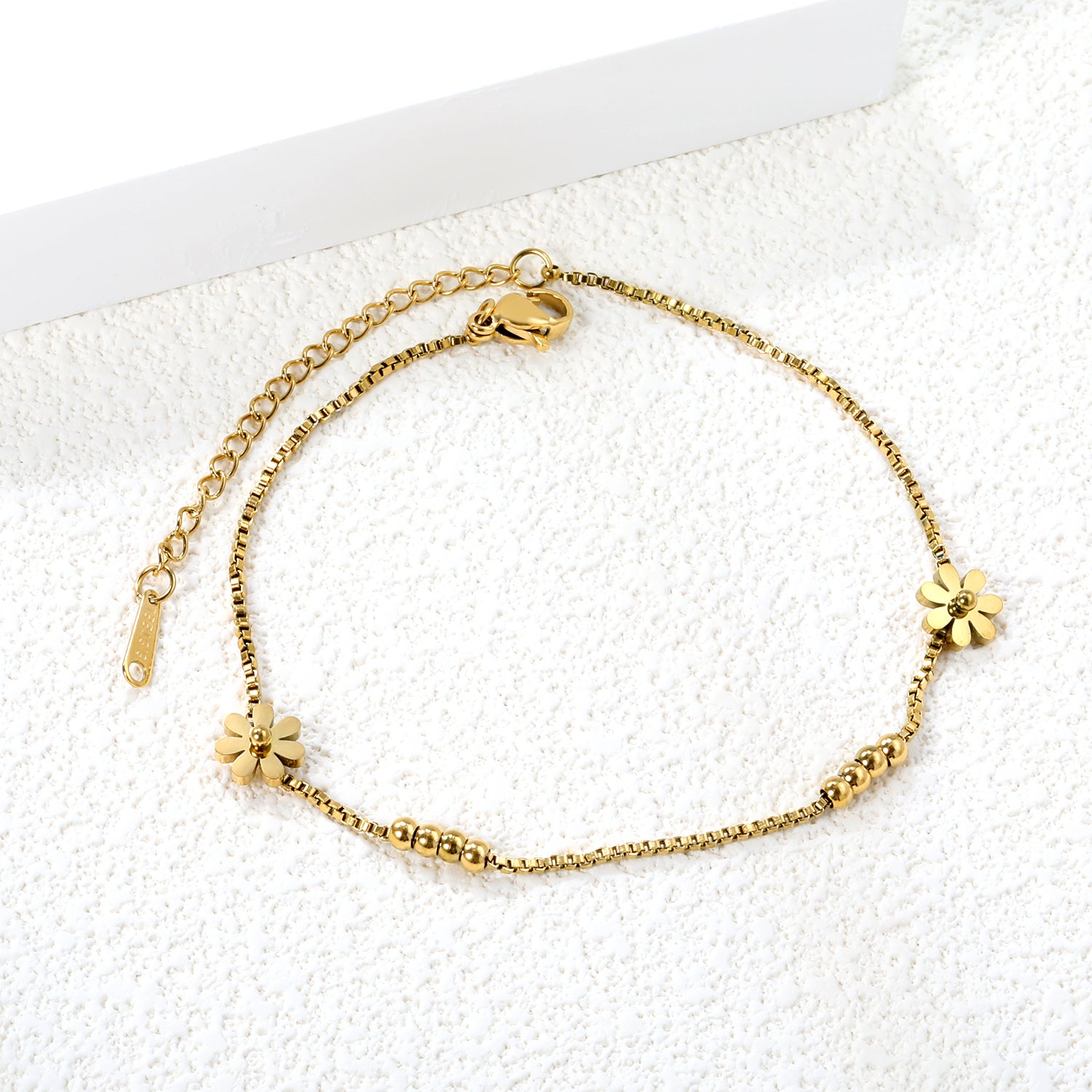 18K gold plated anklet with seven-petal flowers and steel beads blooms with delicate charm, dainty and vibrant. Perfect for beach days, it adds floral sweetness to bare ankles.