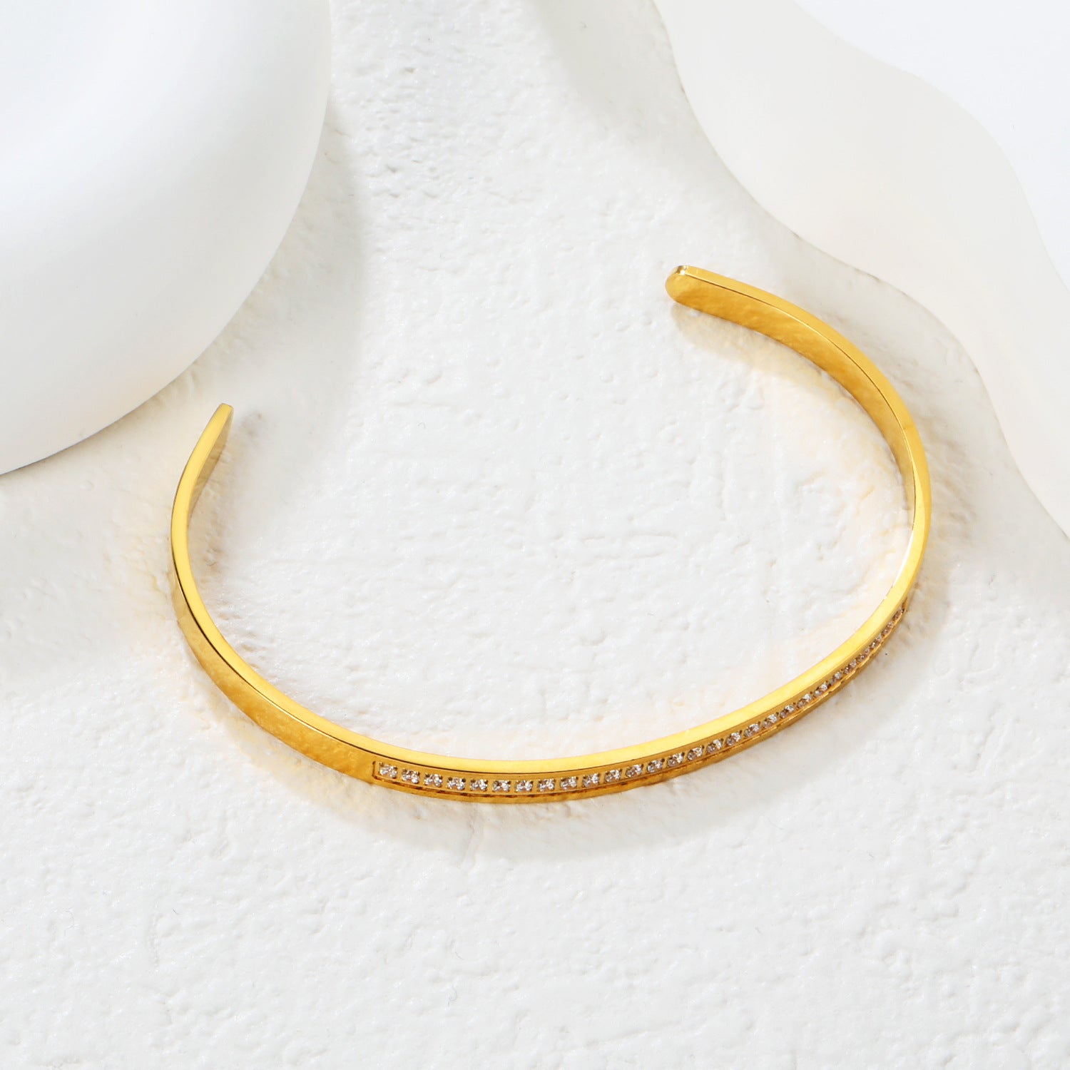 Make a bold statement with this architectural open bangle, designed for wholesale buyers seeking standout pieces. The double-layer construction creates dimensional depth, while the wide domed profile delivers substantial presence on the wrist. Protected by durable PVD gold plating, it withstands daily wear without fading or discoloration. The open design allows for adjustable fit and effortless styling versatility. Perfect for retailers targeting customers who prefer statement jewelry with modern geometric appeal and reliable quality craftsmanship.