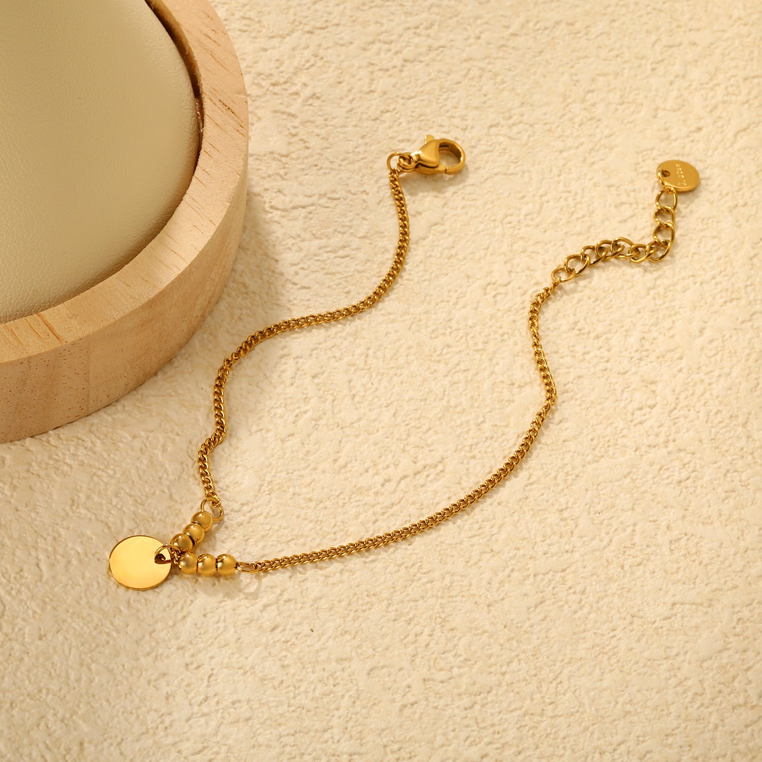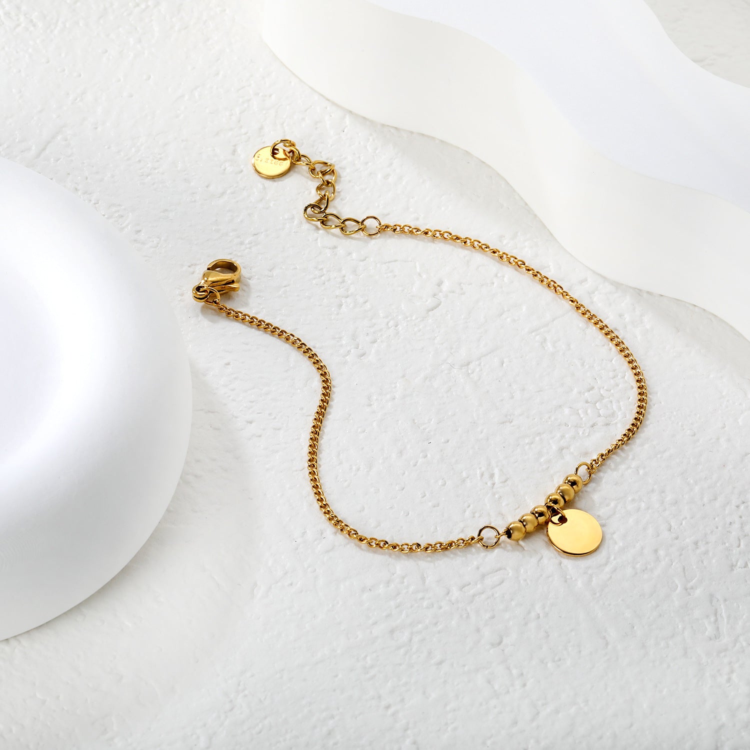 Understated stacking bracelet featuring a minimalist round tag pendant in PVD gold plating. The delicate design prioritizes versatility, layering seamlessly with other pieces or worn solo for subtle elegance. Dainty proportions appeal to customers preferring refined, understated jewelry that complements rather than dominates. PVD coating ensures lasting color integrity and resistance to daily wear degradation. Ideal for wholesale partners seeking stackable essentials that drive repeat purchases and encourage customers to build coordinated collections with reliable quality and timeless appeal.