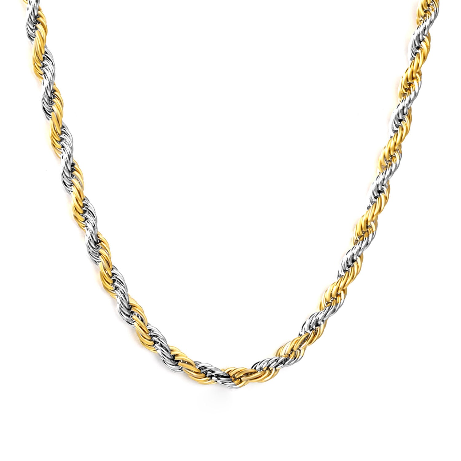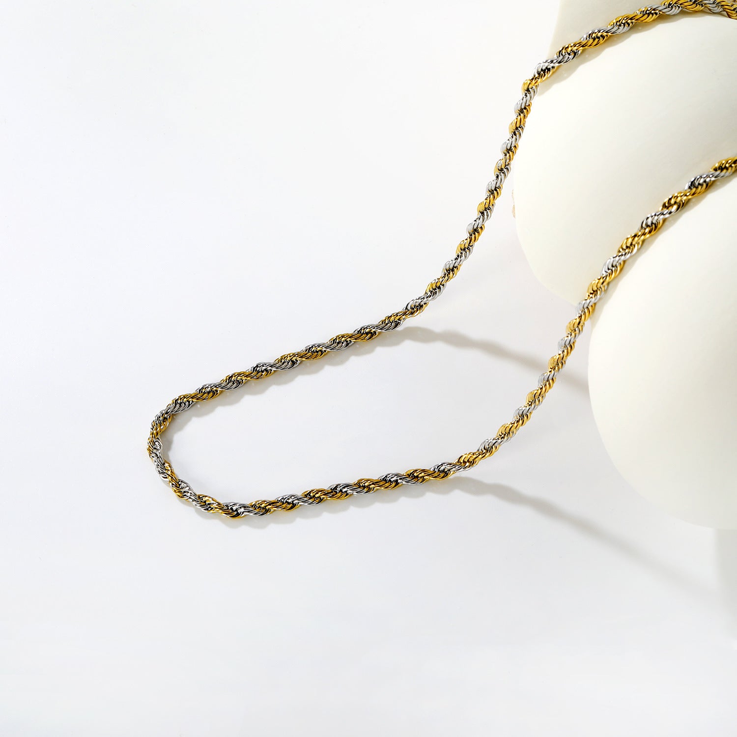 This versatile chain combines PVD gold and silver plating in a twisted wire link design, offering contemporary two-tone aesthetics that complement diverse jewelry styles and personal preferences. The mixed-metal finish bridges warm and cool tones, maximizing styling flexibility for end consumers and reducing inventory pressure on retailers. Twisted link construction provides visual texture and structural integrity, resisting kinking while maintaining elegant proportions. Bulk pricing makes this chain ideal for wholesalers seeking foundational pieces for custom assembly, layering projects, or standalone wear—a reliable workhorse that drives repeat orders and supports multiple product applications.