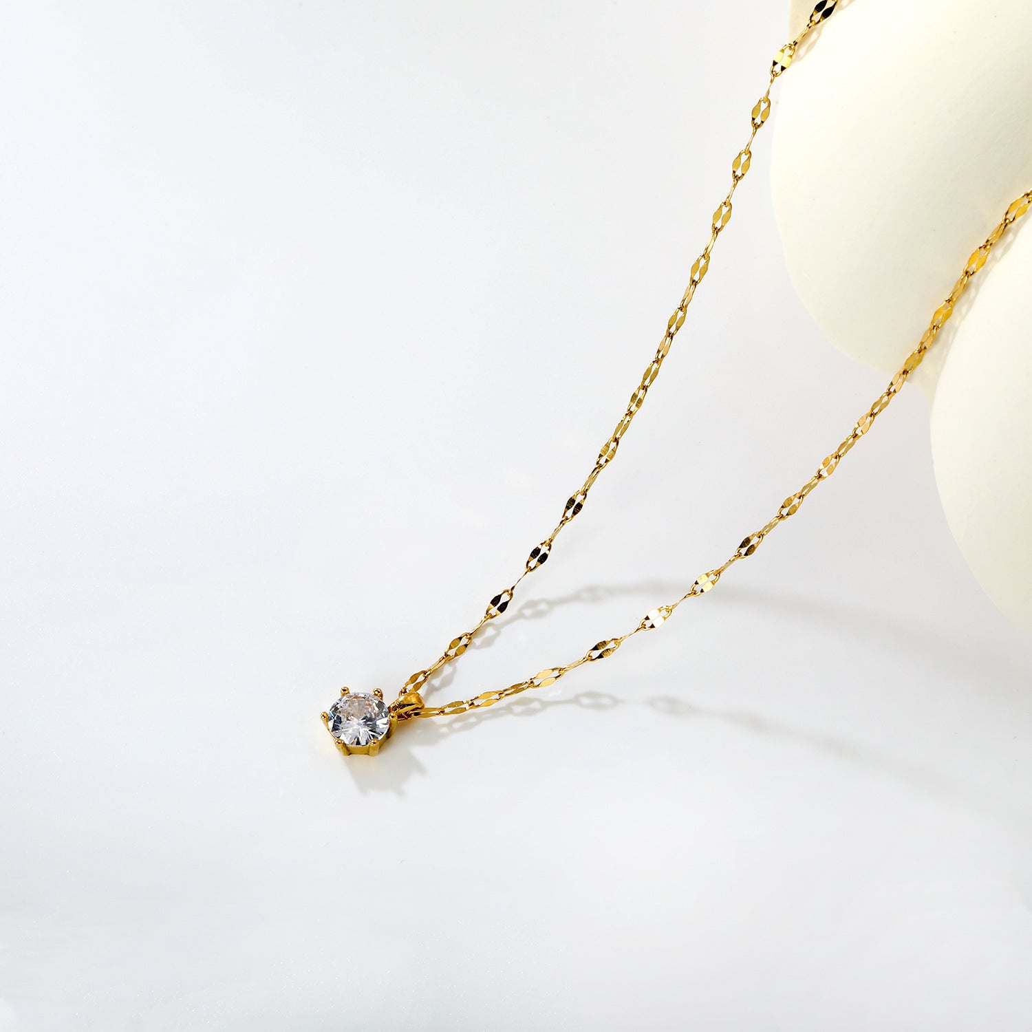 Capture the minimalist jewelry trend with this delicate necklace featuring a solitaire zircon suspended within an oval link, finished in lustrous PVD gold plating. The refined proportions and understated design appeal to consumers seeking everyday elegance without visual heaviness, positioning this piece as a versatile layering essential or standalone statement. Zircon's brilliant sparkle provides eye-catching detail despite the dainty silhouette, maximizing visual impact across diverse lighting conditions. Bulk wholesale pricing supports retailers targeting the growing market for lightweight, sophisticated pieces that transition seamlessly from casual to professional settings while maintaining exceptional durability and color stability.