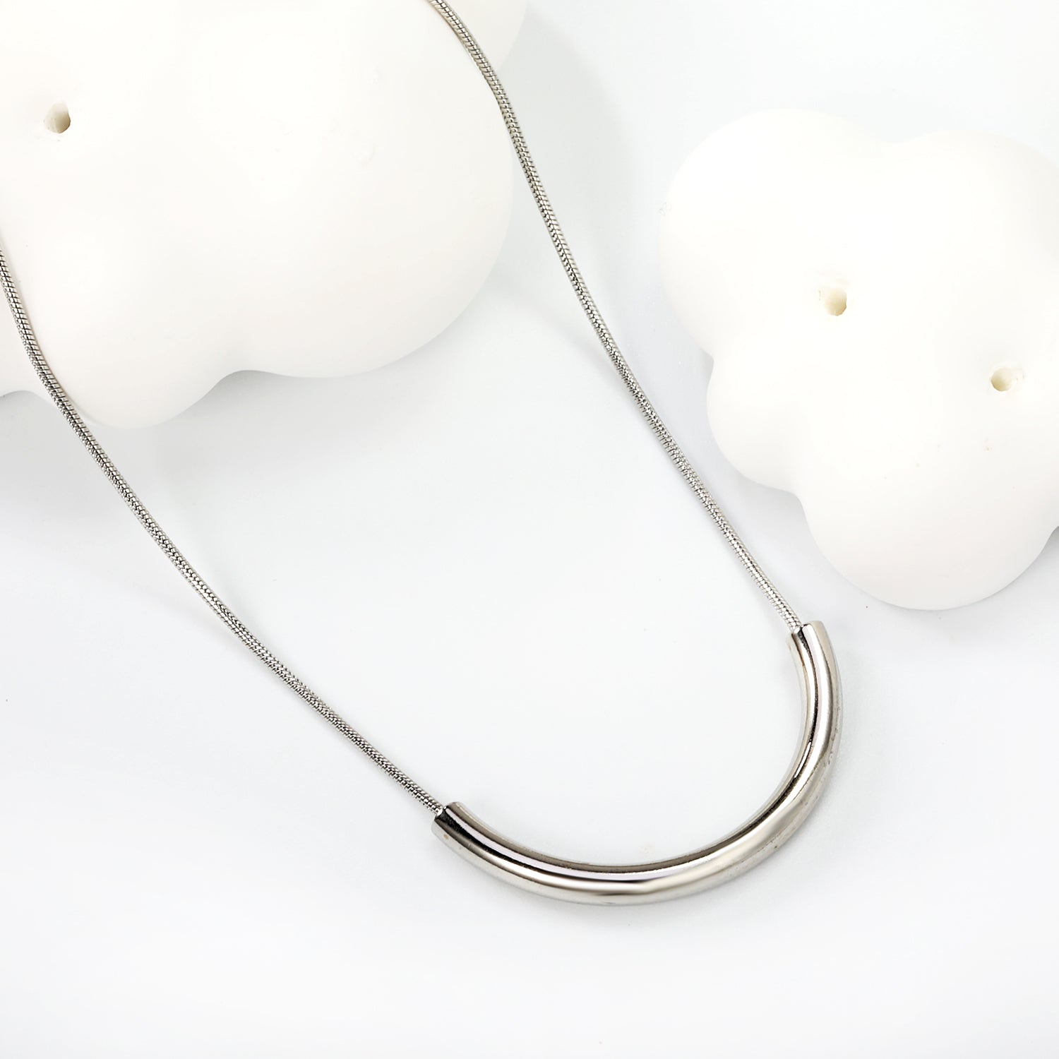 Minimalist stainless steel necklace with a distinctive arc shape. Tarnish-resistant and durable, this modern piece elegantly frames the neckline for both everyday and special occasions.