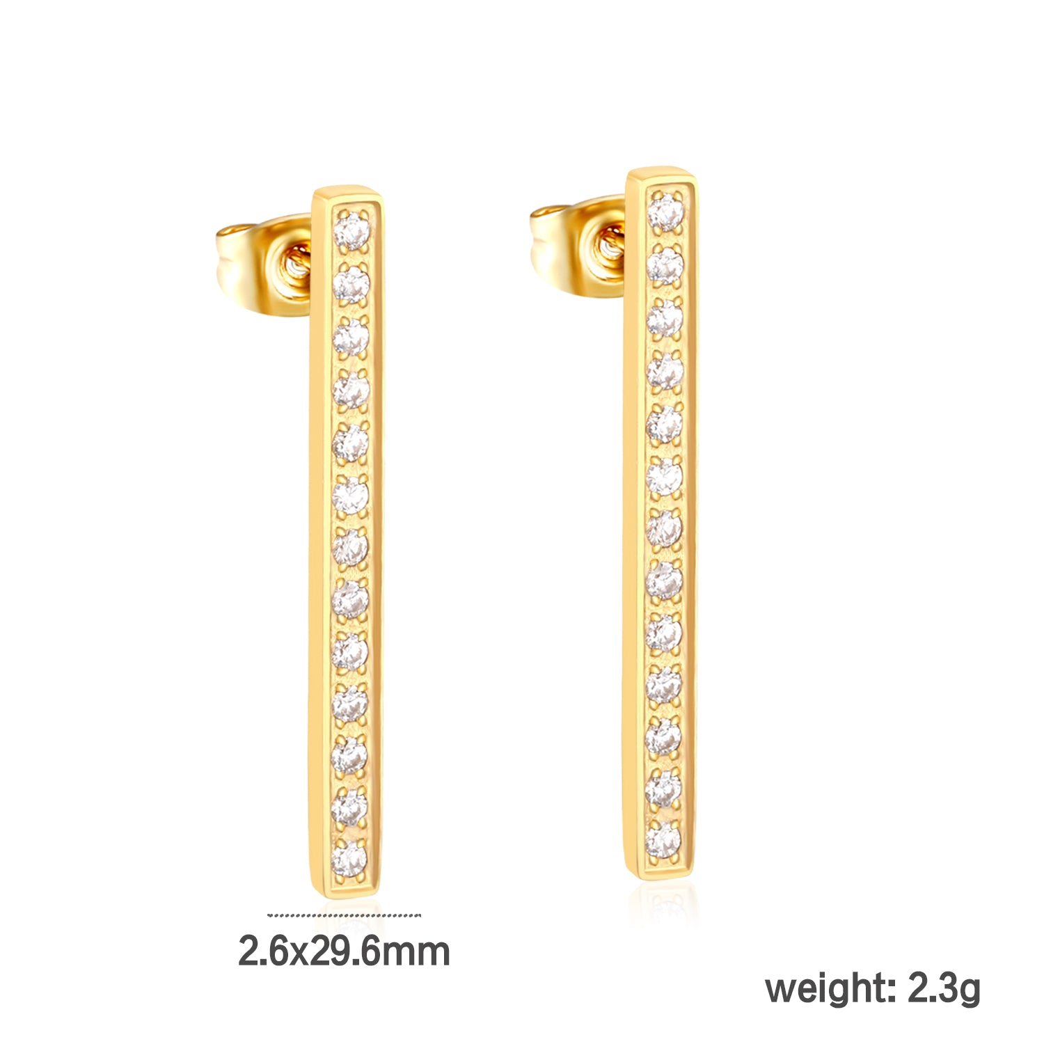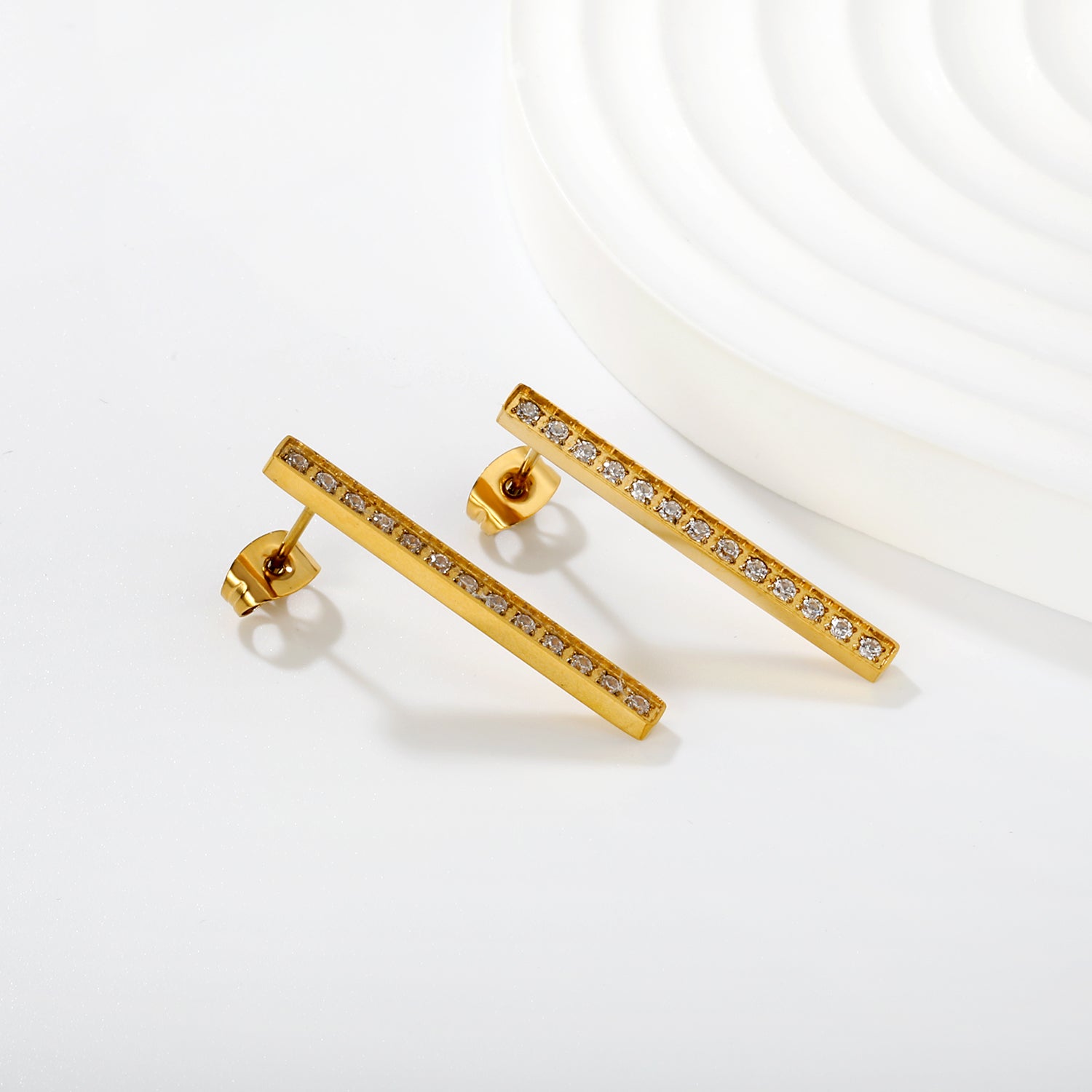 Shop modern minimalist jewelry! 29.7mm straight line studs with precision CNC pave diamonds. Waterproof PVD plated stainless steel is Tarnish-Free.