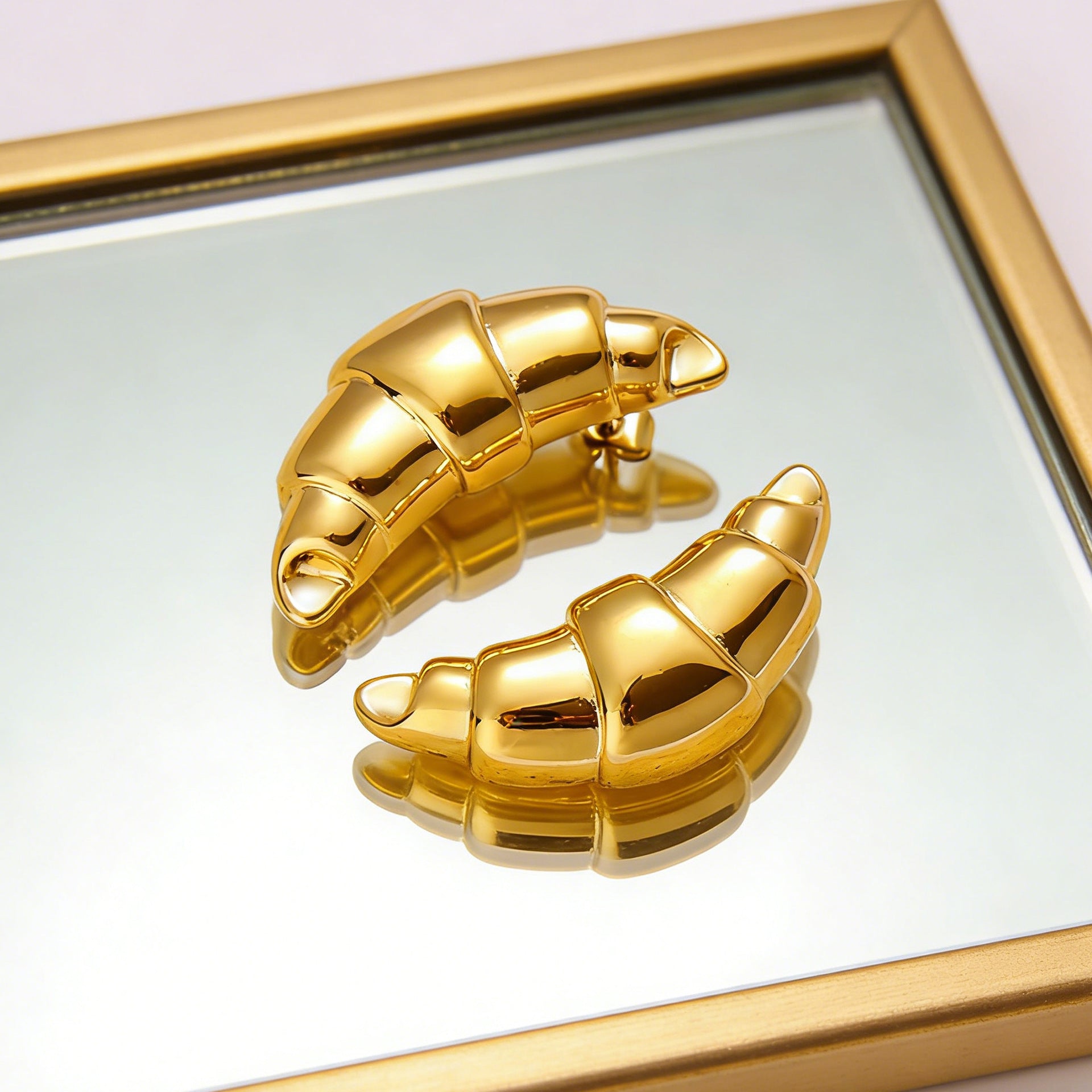 Celebrate culinary passion with these whimsical gold croissant earrings that bring playful personality to your jewelry collection. The detailed croissant design captures the beloved pastry's iconic flaky layers and curved silhouette, appealing to food enthusiasts and those with a sense of humor. Crafted from non-tarnish stainless steel with gold finishing, these earrings maintain their lustrous appearance through constant wear without requiring maintenance. The lighthearted design sparks conversation while delivering quality craftsmanship and reliable durability. Perfect for those seeking jewelry that expresses individuality and celebrates life's simple pleasures—a charming statement piece that combines artistic detail with everyday wearability and lasting quality.