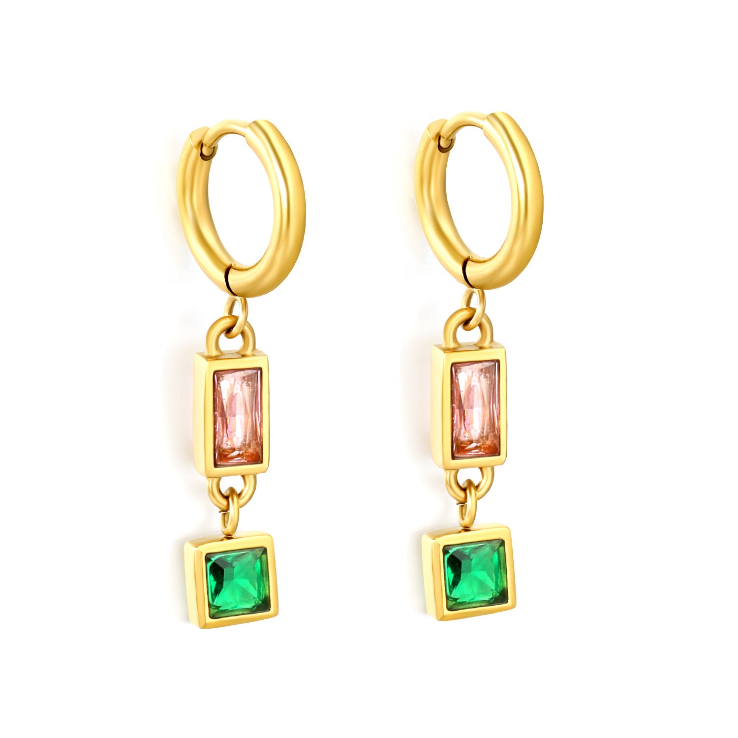 Stainless Steel Earrings | Pink & Green Zircon Square Hoops