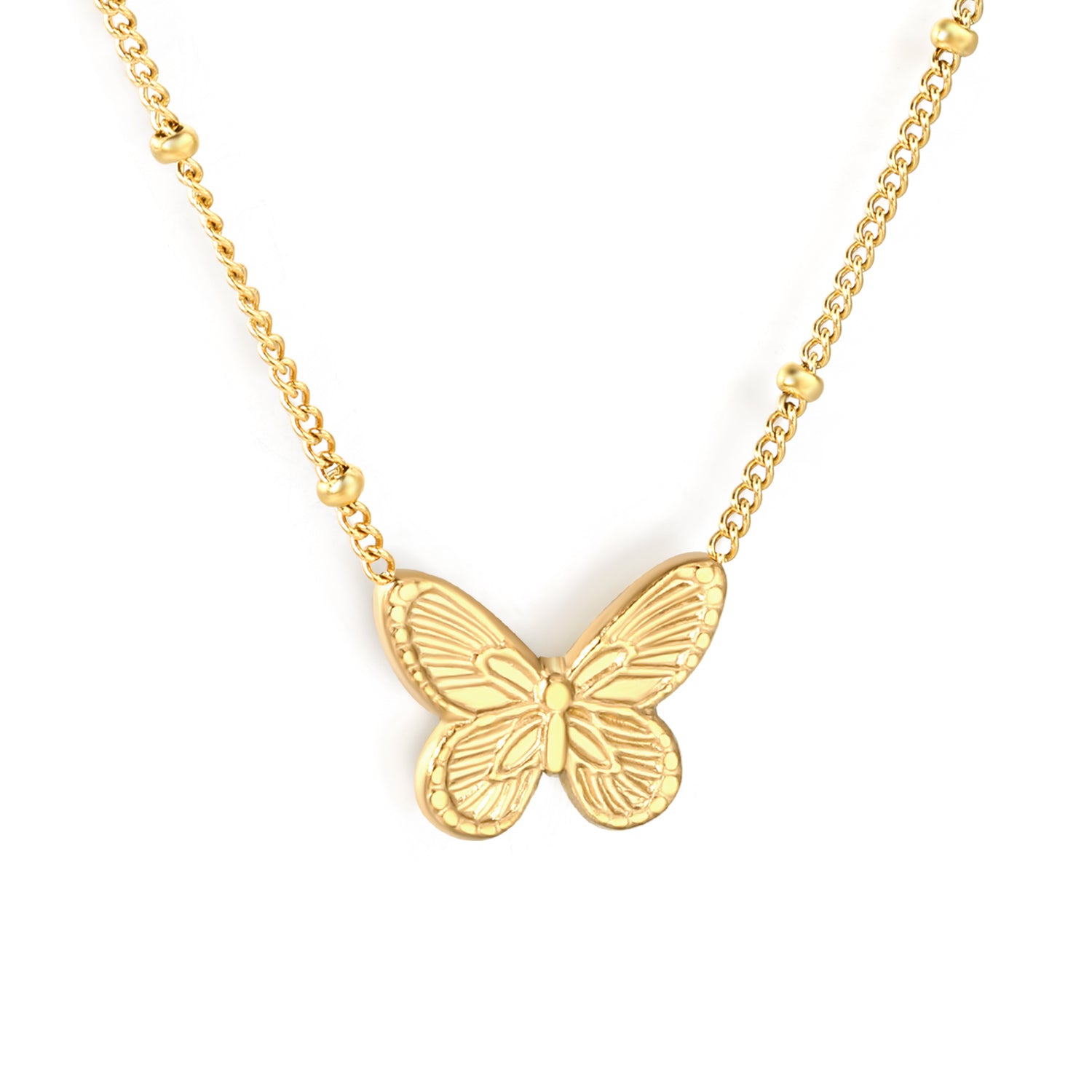 This Wholesale 18K Gold Plated Butterfly Pendant Necklace features delicate wing texture that captures the essence of nature with a light luxury feel. Its elegant design adds a subtle touch of grace, perfect for everyday wear or special moments. The durable gold plating ensures lasting shine, making it an ideal choice for retailers offering refined, nature-inspired jewelry with a gentle, sophisticated appeal.