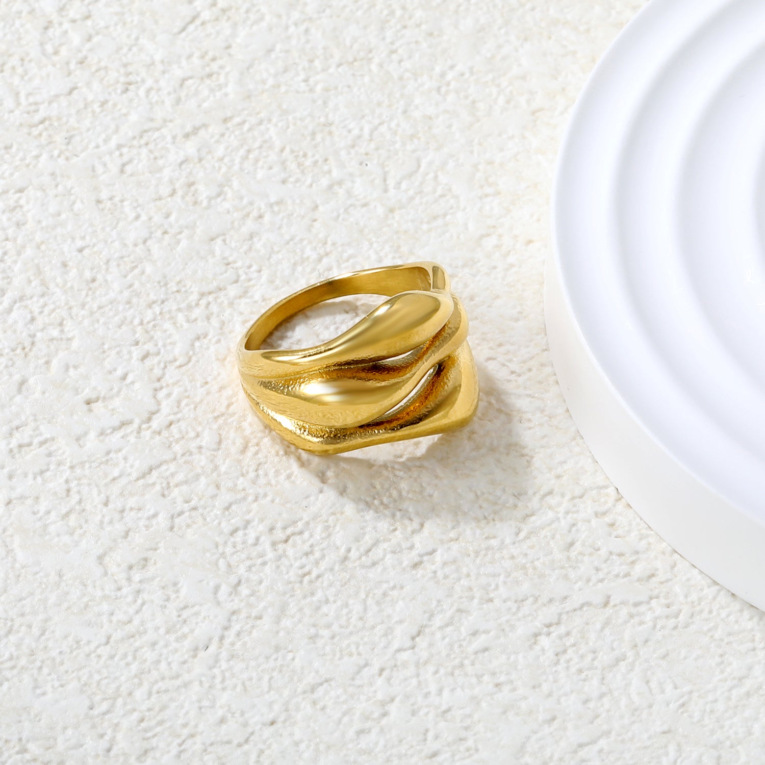 This 18K gold-plated dual wave ring features a negative space architectural design that balances light luxury with artistic elegance. Its flowing curves and open structure create a refined, contemporary accessory that adds sophistication and modern style to any jewelry collection.