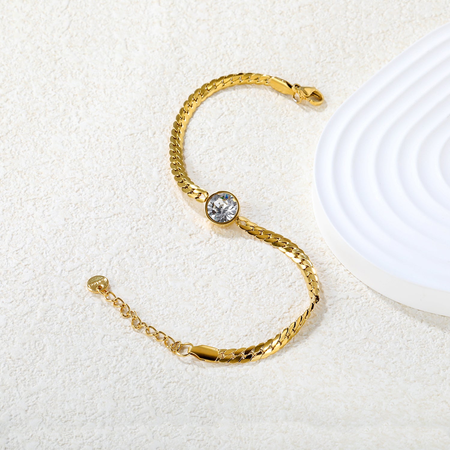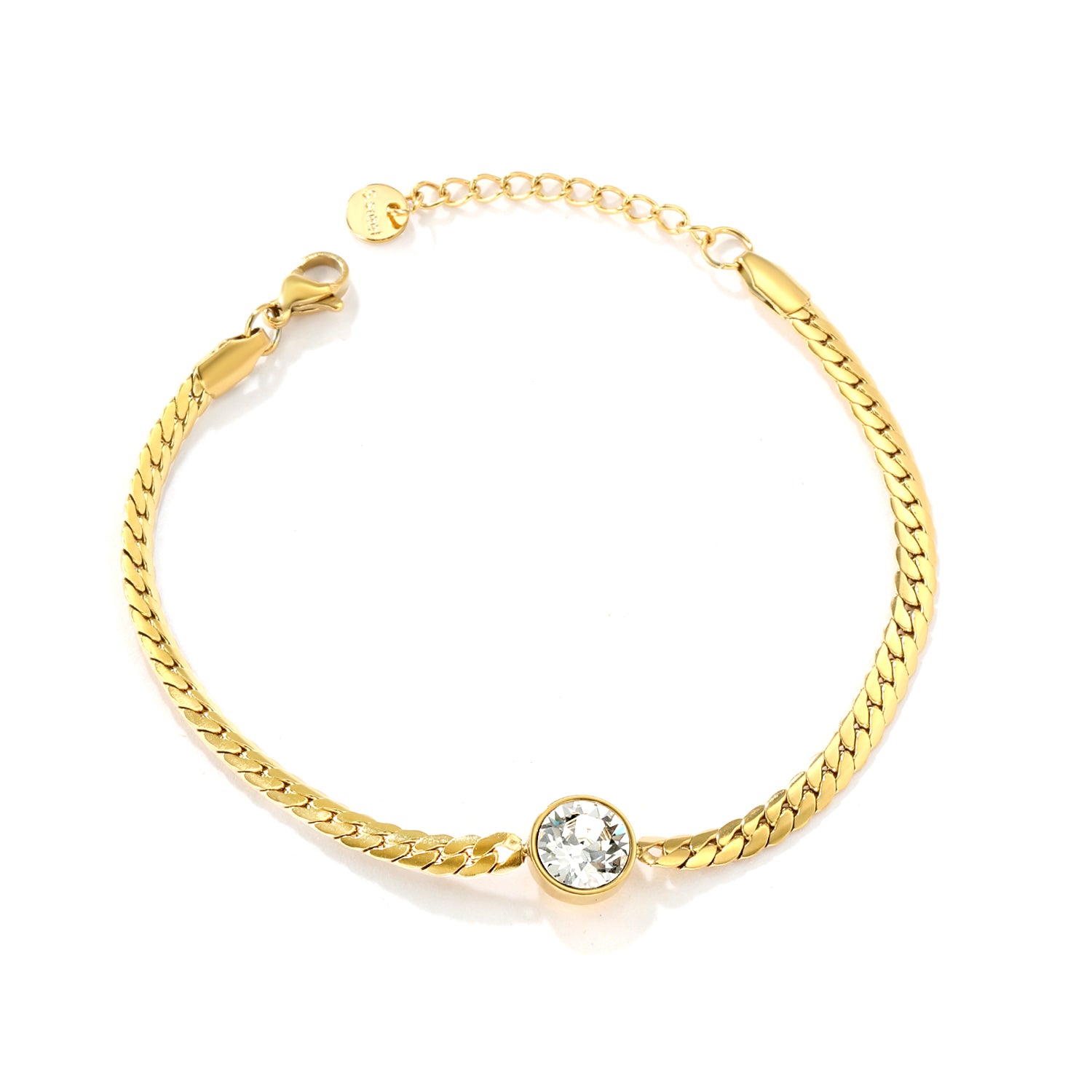 This wholesale 18K gold plated flat link bracelet features a solitaire diamond center, blending vintage luxury with an industrial tank chain design. Its unique combination offers timeless elegance with a modern edge, perfect for customers seeking a statement piece that supports both style and sophistication.