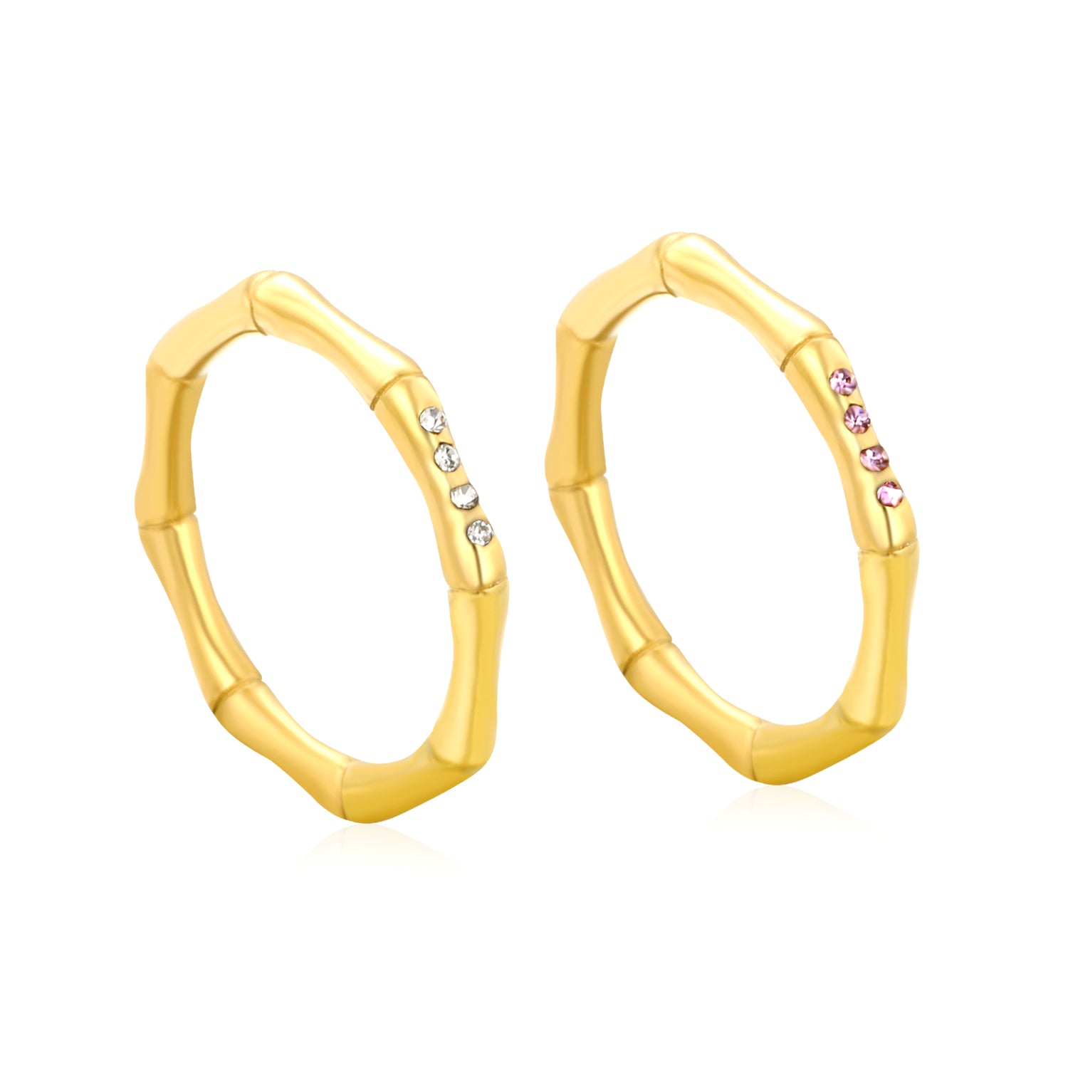 This 18K gold-plated geometric bamboo ring features a minimalist open band design accented with sparkling diamonds and a touch of amethyst. Its sleek, modern style offers a subtle yet luxurious statement, perfect for everyday wear or special occasions. Durable and elegant, it adds a refined touch to any jewelry collection.
