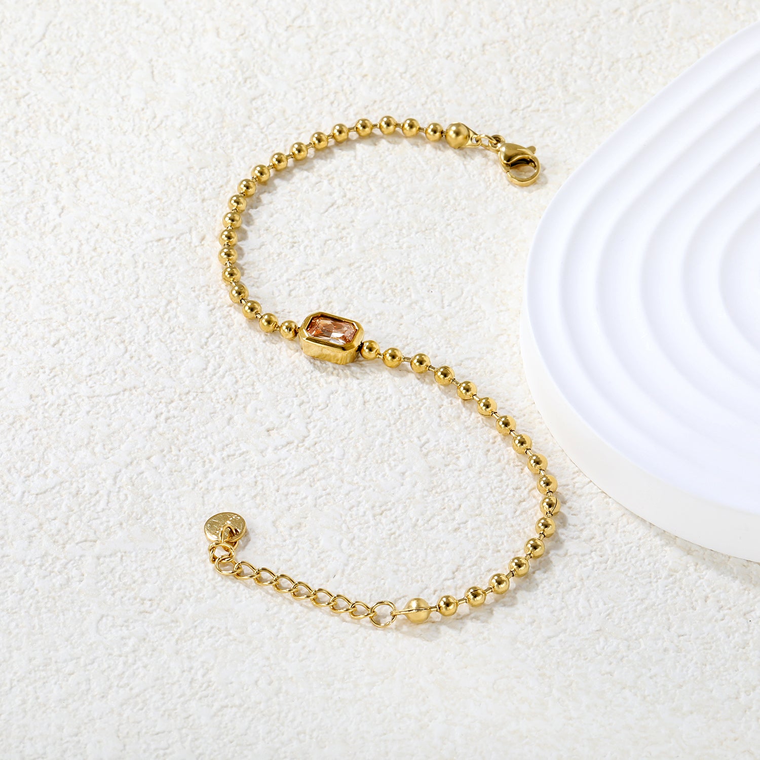This wholesale 18K gold-plated steel ball chain bracelet features a stunning gemstone inlay, combining durable materials with elegant detailing. Its sleek design offers a versatile accessory that supports customers seeking both strength and refined style in one piece.