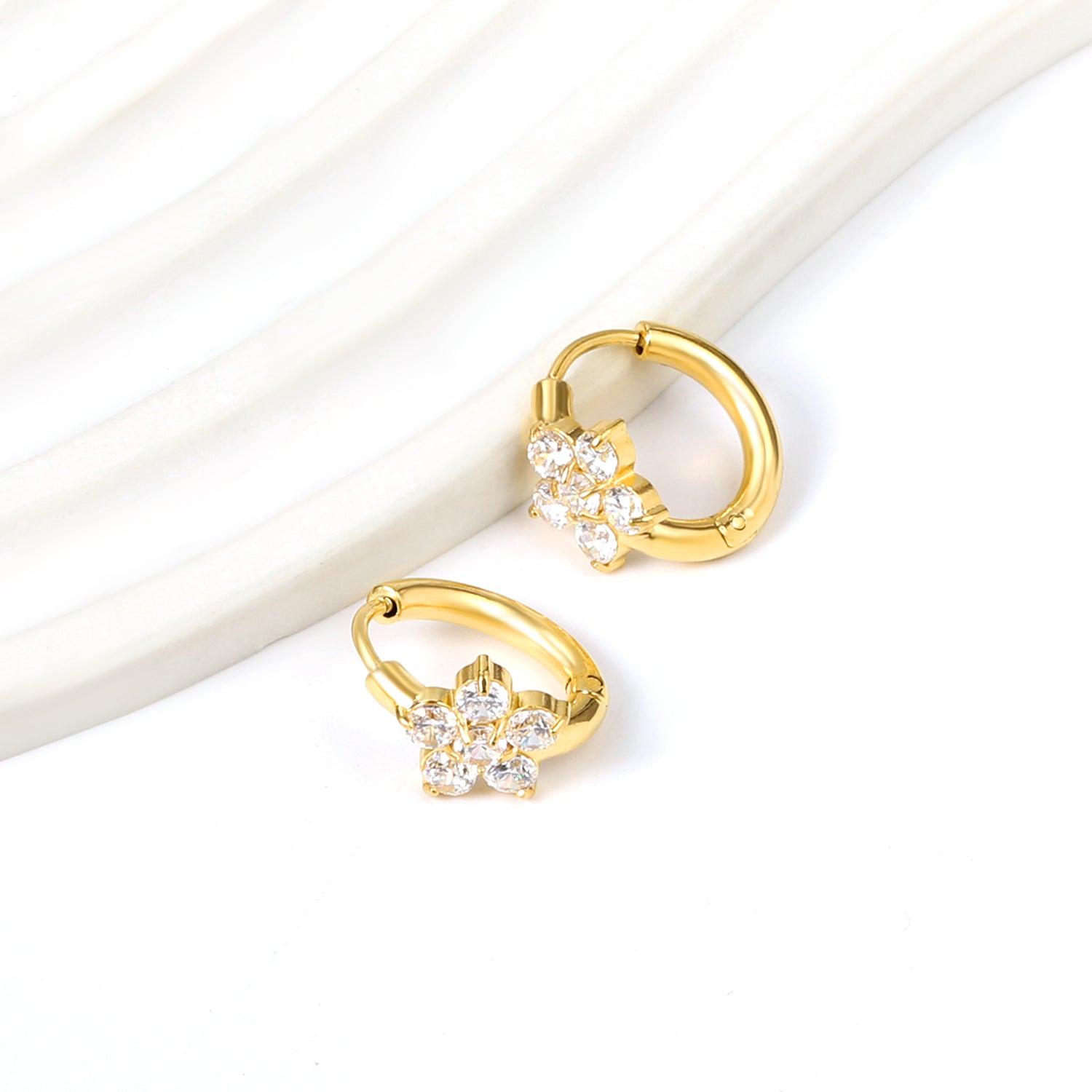 These gold flower-shaped hoop earrings with diamond accents are a charming and elegant choice for jewelry suppliers to offer their customers.