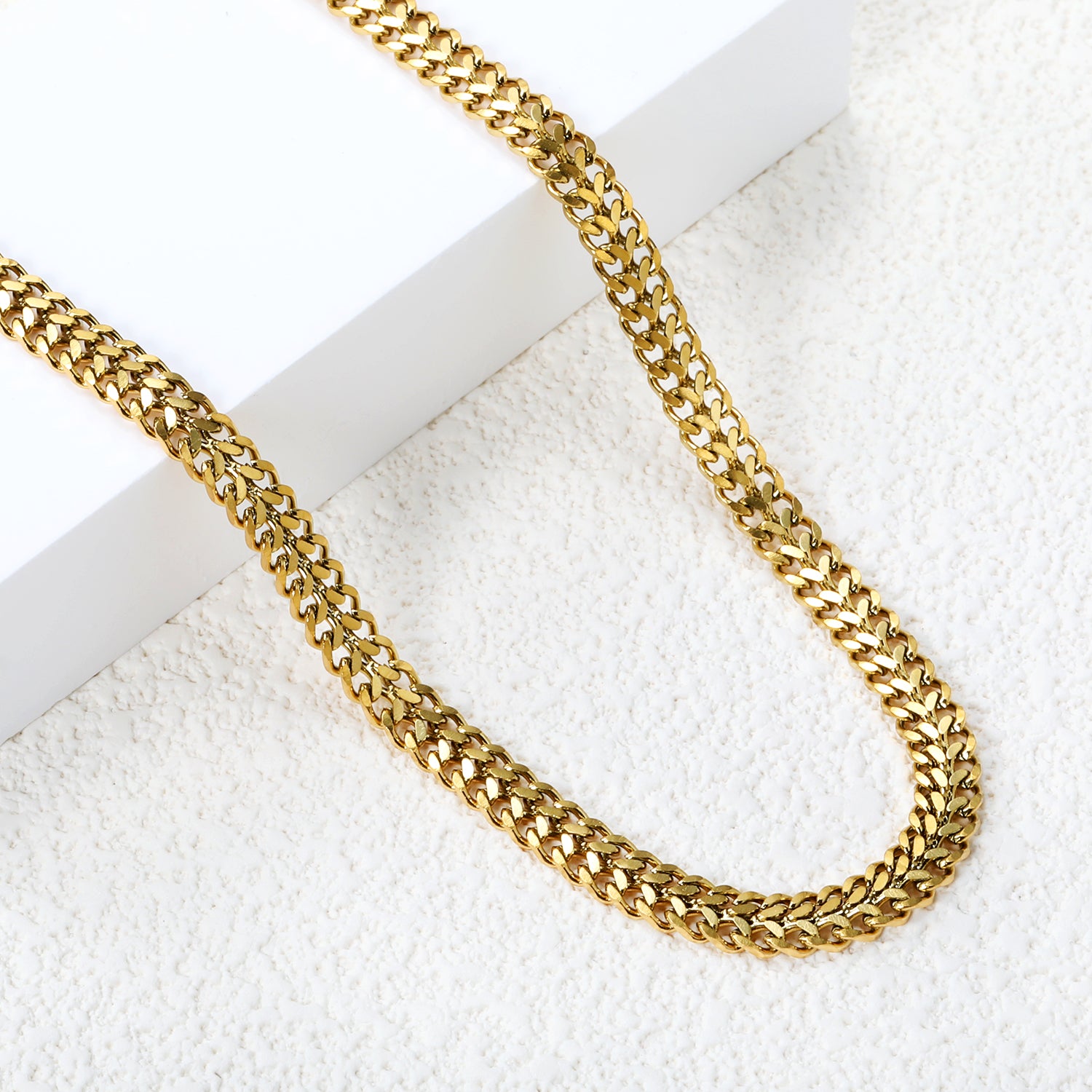 Durable stainless steel necklace with distinctive double chain design. Tarnish-resistant with interwoven pattern. Available wholesale for retailers seeking versatile, contemporary jewelry options.