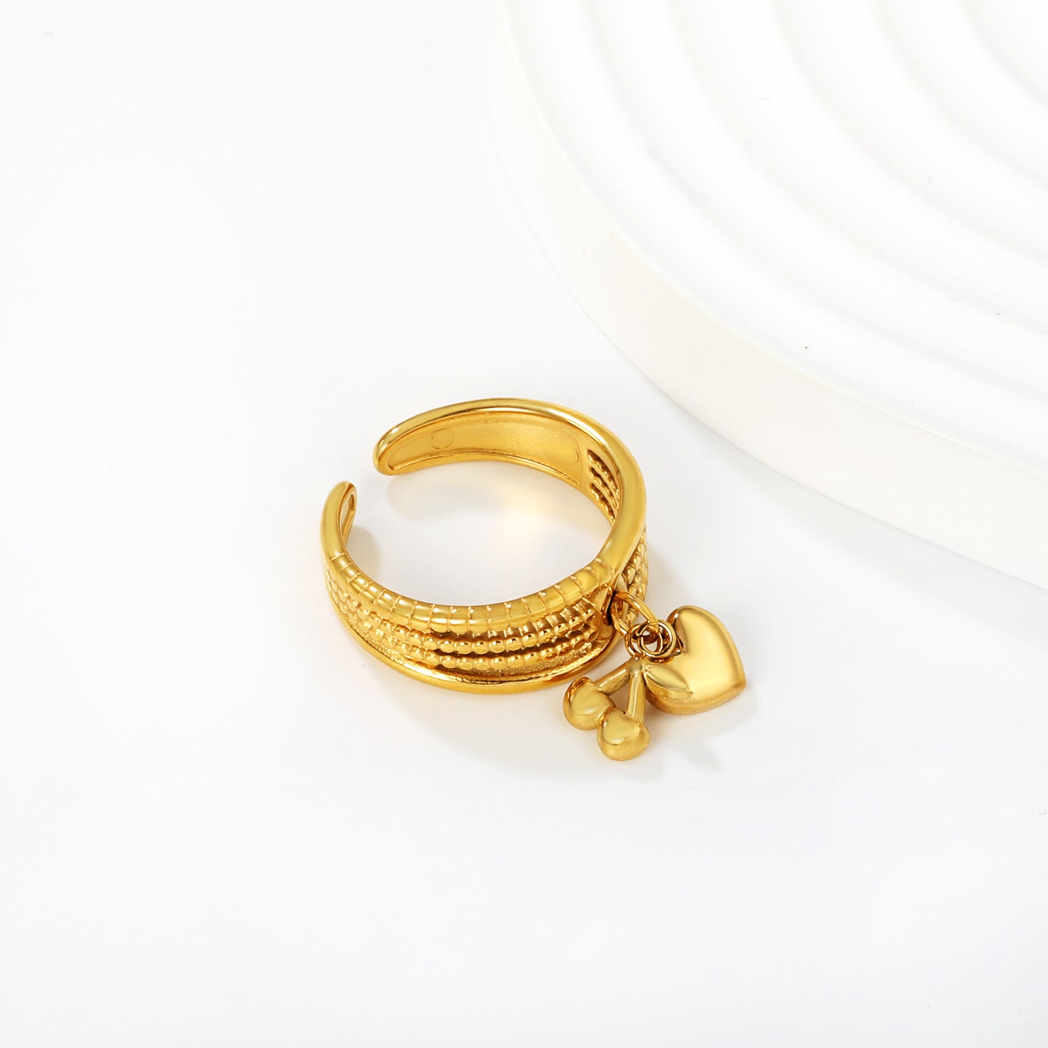 Bold heart charm statement ring with waterproof PVD gold plating for reliable everyday wear. The prominent heart design appeals to gift-giving occasions and sentiment-focused consumers. Waterproof construction handles daily moisture exposure while PVD plating resists oxidation across retail cycles. Statement-scale design works as a confident focal piece. Strong wholesale choice for retailers targeting meaningful jewelry with proven durability and accessible pricing.
