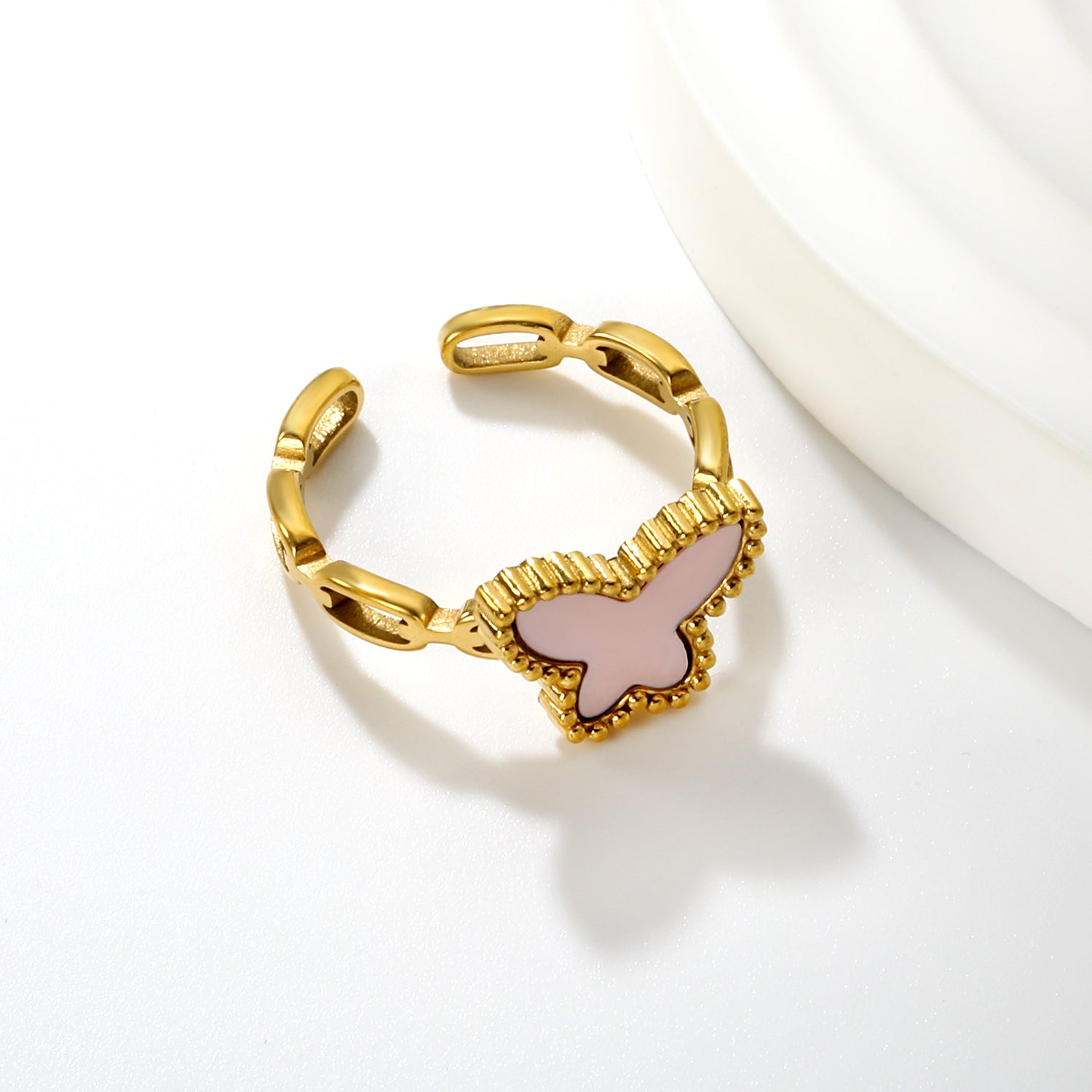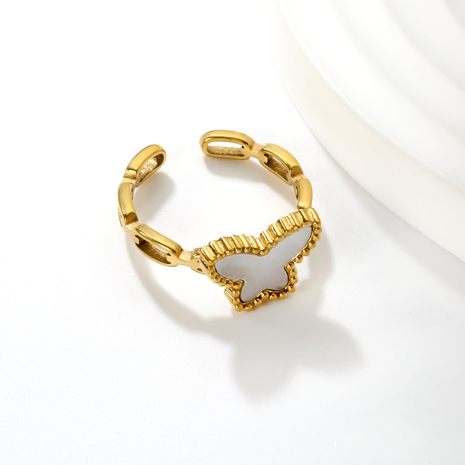 This delicate open ring (approx. size 7) offers a sweet element daily style with its 10.7mm-tall structure and charming butterfly-shaped accessory. The textured golden ring body perfectly complements the butterfly, which is available in five different materials¡ªincluding natural Malachite, soft-textured White Shell and Pink Shell, and brightly colored Red/Black Acrylic. Crafted from 18K PVD Gold Plated 316L Stainless Steel, this piece is Waterproof and Tarnish-Free, providing a cute, layered, and versatile look for commuting or light-casual outfits.