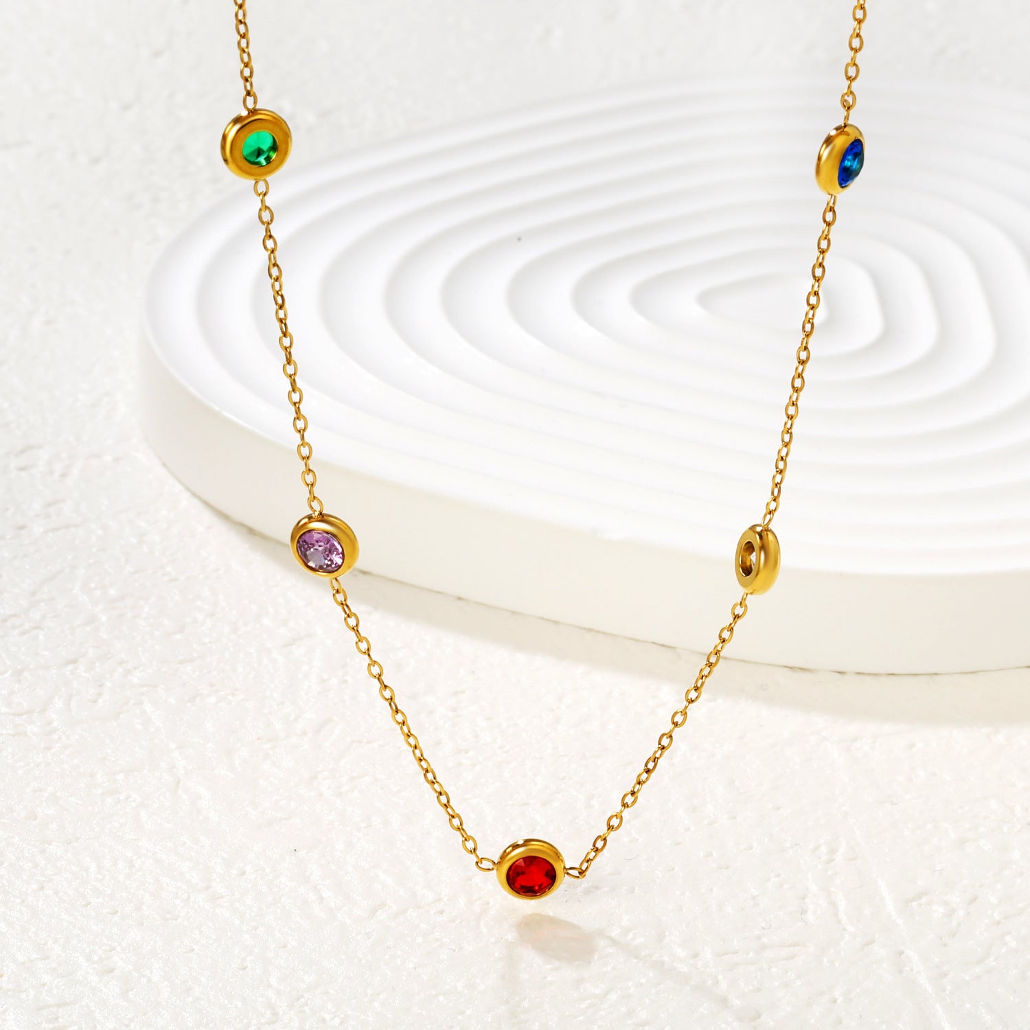 This elegant V-shape necklace showcases multi-color cubic zirconia stones arranged in a refined geometric pattern, finished in waterproof PVD gold plating for lasting brilliance. The slim silhouette delivers sophisticated visual impact without bulk, appealing to consumers seeking versatile pieces suitable for both casual and occasion wear. Multi-color CZ stones provide dynamic sparkle and rainbow-like radiance, while the PVD coating resists water, humidity, and oxidation—ensuring reliable performance across diverse climates and daily conditions. An excellent wholesale addition that combines contemporary design with commercial durability, perfect for retailers building collections that balance luxury aesthetics with practical longevity.