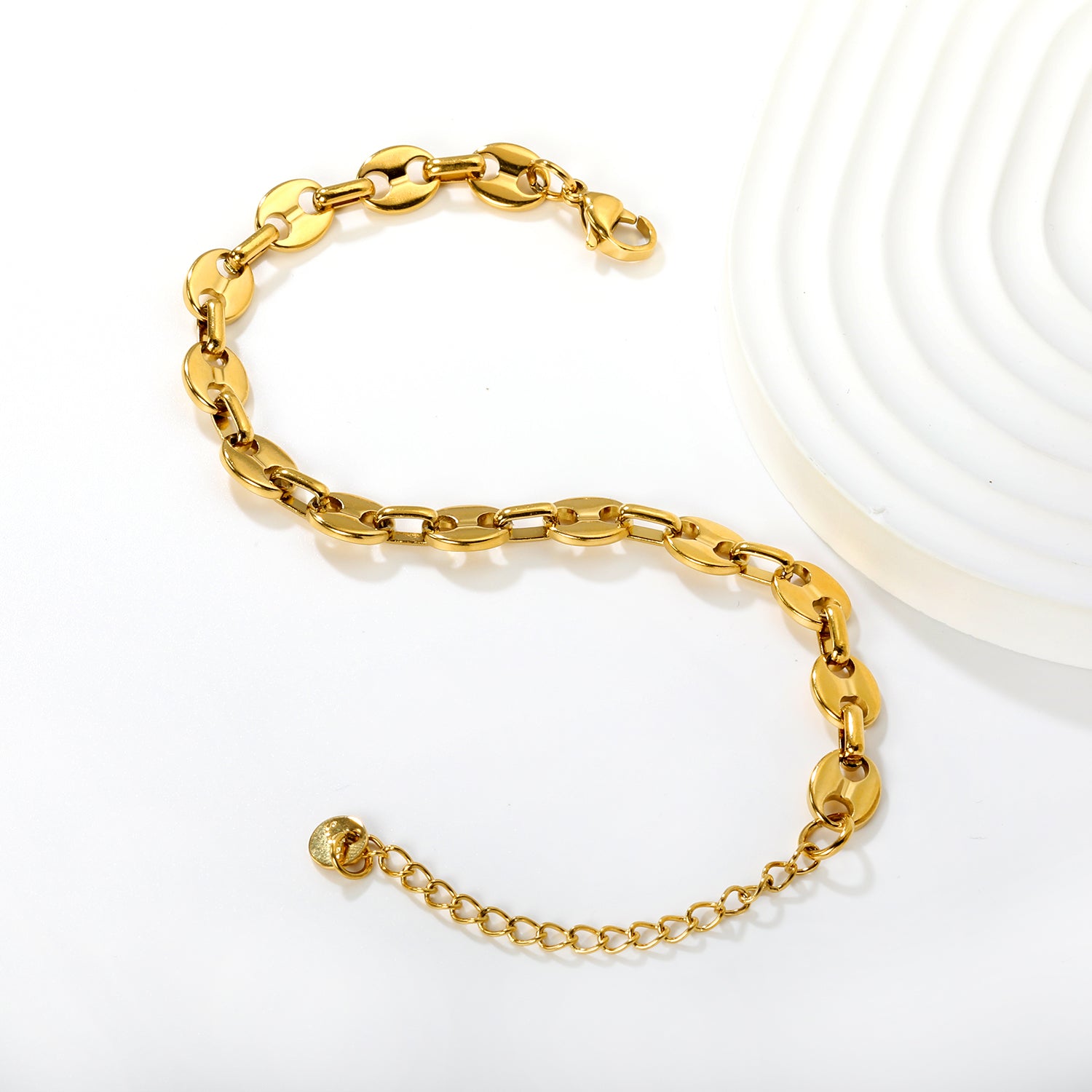 Source niche fashion jewelry! 9.3mm linked pig nose (coffee bean) charms on an 18+5cm chain. Waterproof PVD plated stainless steel is Hypoallergenic.