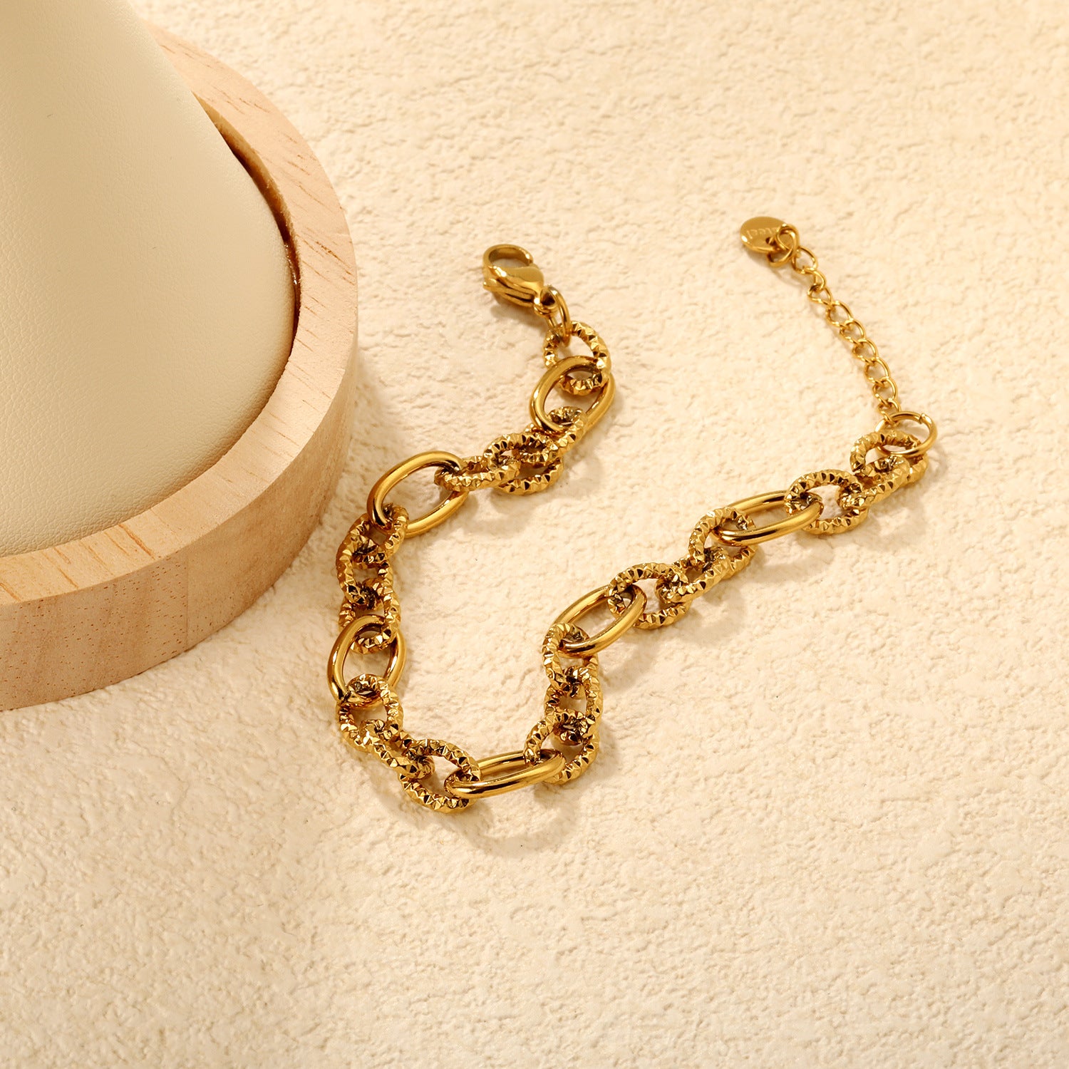 Elegant bracelet showcasing sculpted hollow motif oval links in waterproof PVD gold plating. The openwork design creates visual lightness while maintaining structural integrity, appealing to customers seeking sophisticated pieces with dimensional complexity. Hollow construction reduces weight without compromising presence, ensuring comfortable extended wear. Waterproof technology protects against moisture exposure and environmental degradation across varied climates. The oval link composition delivers classic appeal with contemporary refinement, offering versatile styling compatibility. Wholesale partners benefit from distinctive hollow aesthetic differentiation, reliable PVD durability, and timeless design language that resonates with retailers targeting customers who appreciate intricate craftsmanship and refined elegance in their jewelry selections.