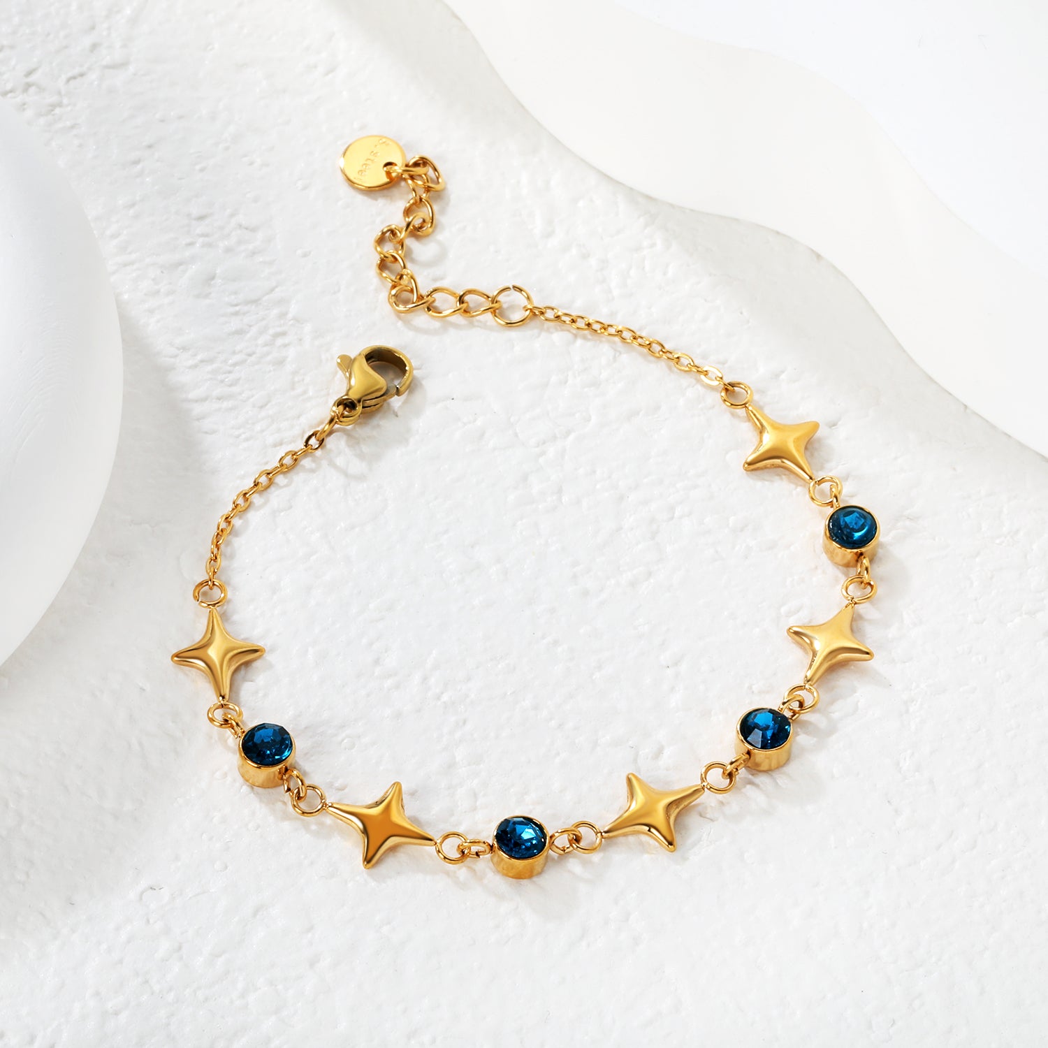 Source fresh, lovely jewelry! Features 9*8mm star splicing with 5mm white/blue round CZs on a 17+3cm adjustable chain. Waterproof PVD plated stainless steel is Hypoallergenic.