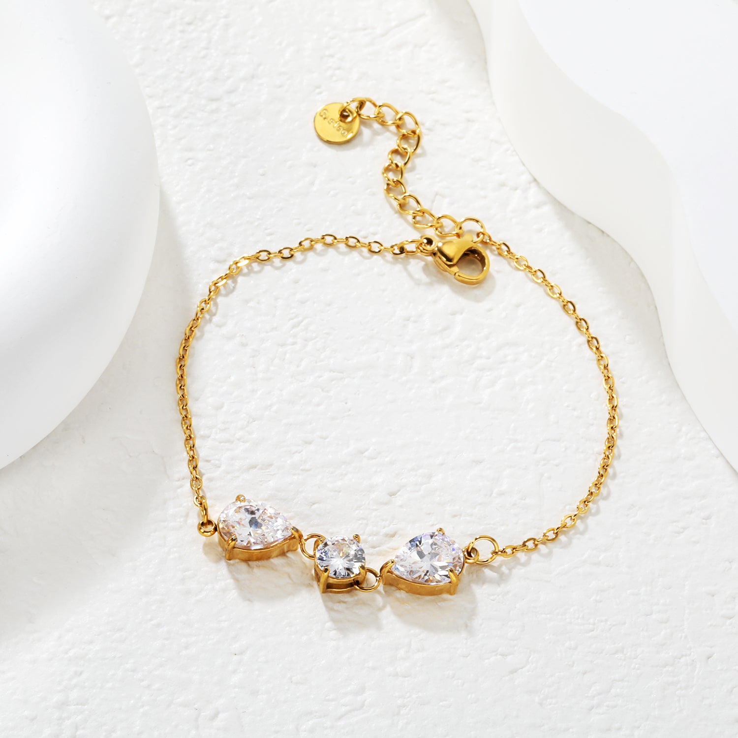 This elegant bracelet features two prominent 7*9mm pear-cut white gemstones and one 7mm round white gemstone set along a delicate 0.4mm adjustable cross chain (18+3cm). Crafted from 18K PVD Gold Plated 316L Stainless Steel, this piece is Waterproof and Tarnish-Free, offering a light luxury, eye-catching look for daily commuting or dating.